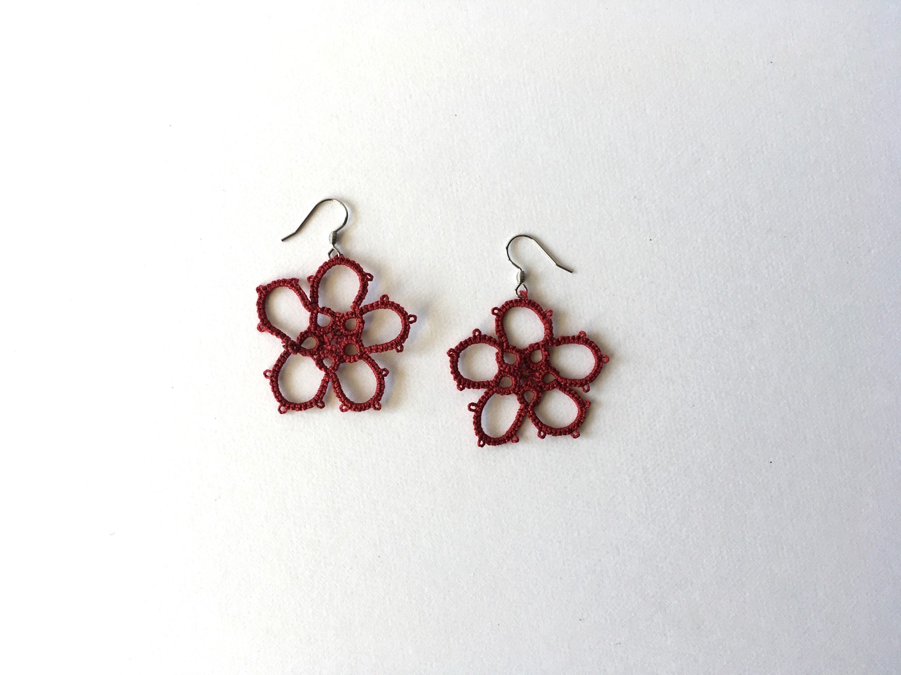 美しいタティングレースで手作りされた、エレガントなフック式ピアス。